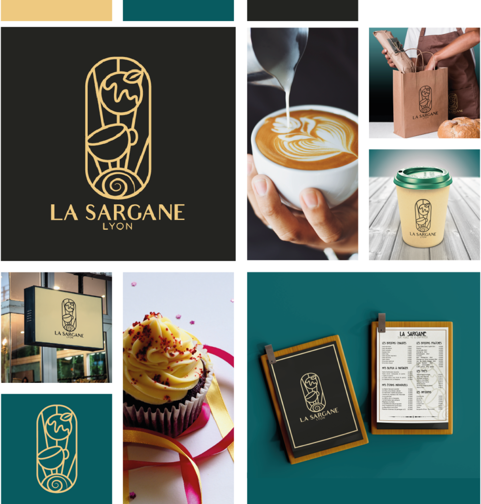 La Sargane est un salon de thé-pâtisserie fictif. J’ai développé toute l’identité graphique de l’établissement. J’ai d’abord conceptualisé un logo en forme de bijou pour cette marque de pâtisserie haut de gamme.